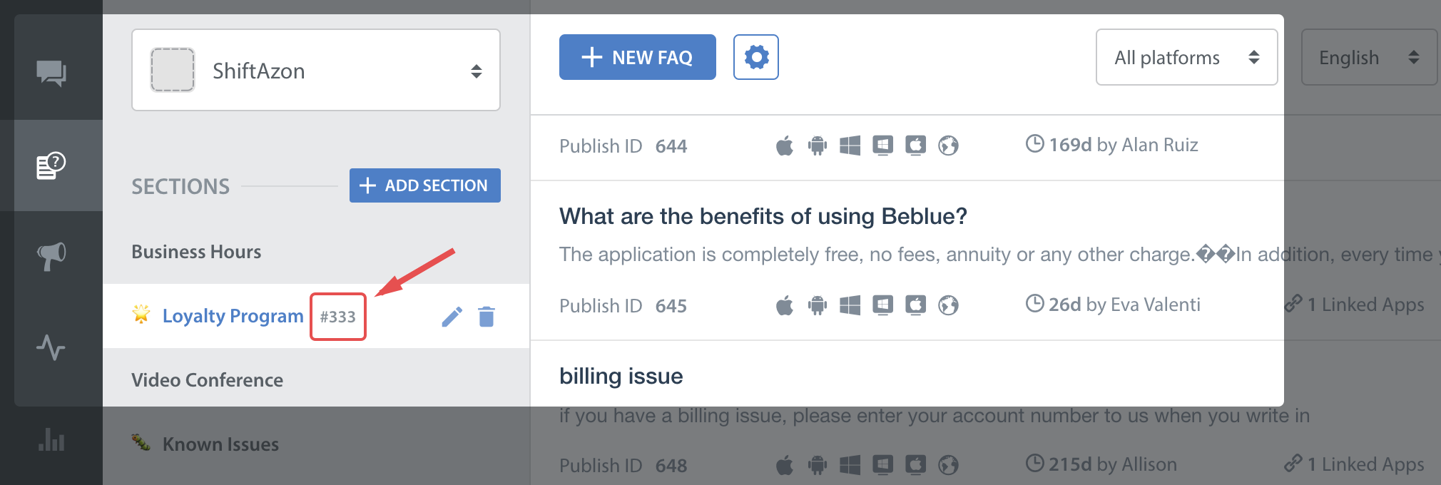 This feature works like a permalink for displaying specific FAQ sections as context sensitive help in your app. For example, if your app requires the user to login to using email, facebook and twitter, you could wire a help action on the login screen that can link to the Helpshift FAQ section called "Login help" which has several questions related to login methods.